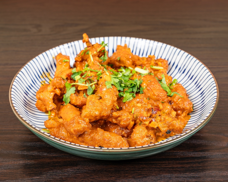 Deep fried spiced chicken tossed with soya sauce based gravy cooked to chef’s perfection